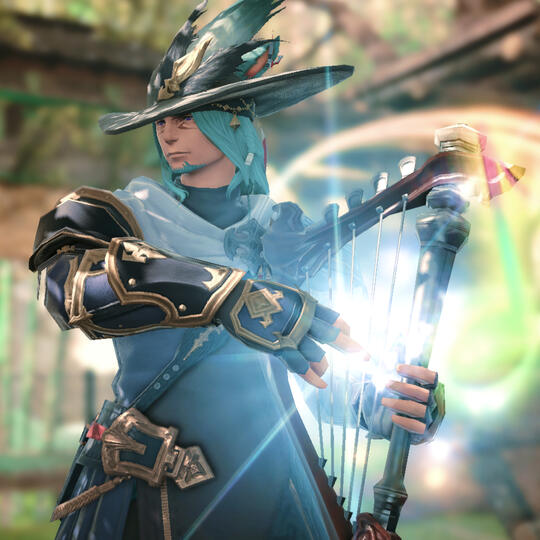 Stoic and serious most of the time, Sako wears a plain expression, but has a warmth about him, smiling at those who pass by. Usually garbed in green he is known to wear plated archer armor and a feathered hat when performing. A braid dangles down the left side of his head nearing his shoulder.